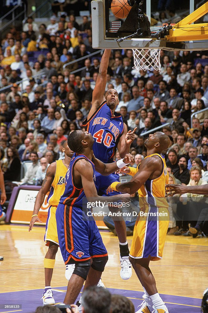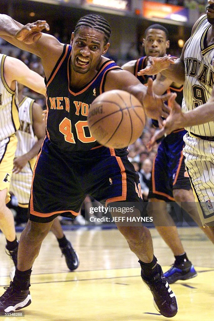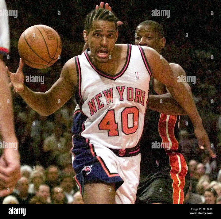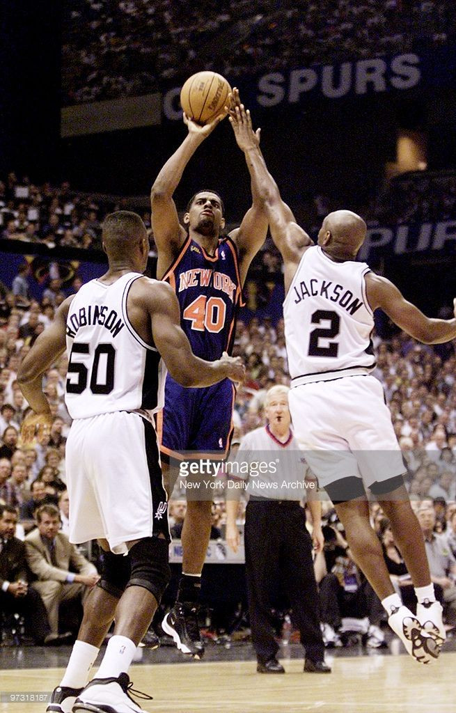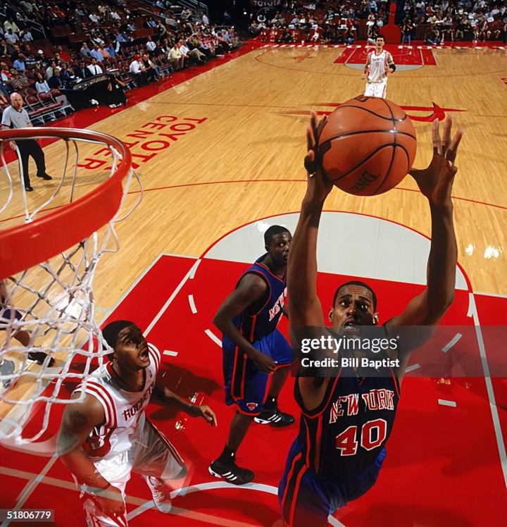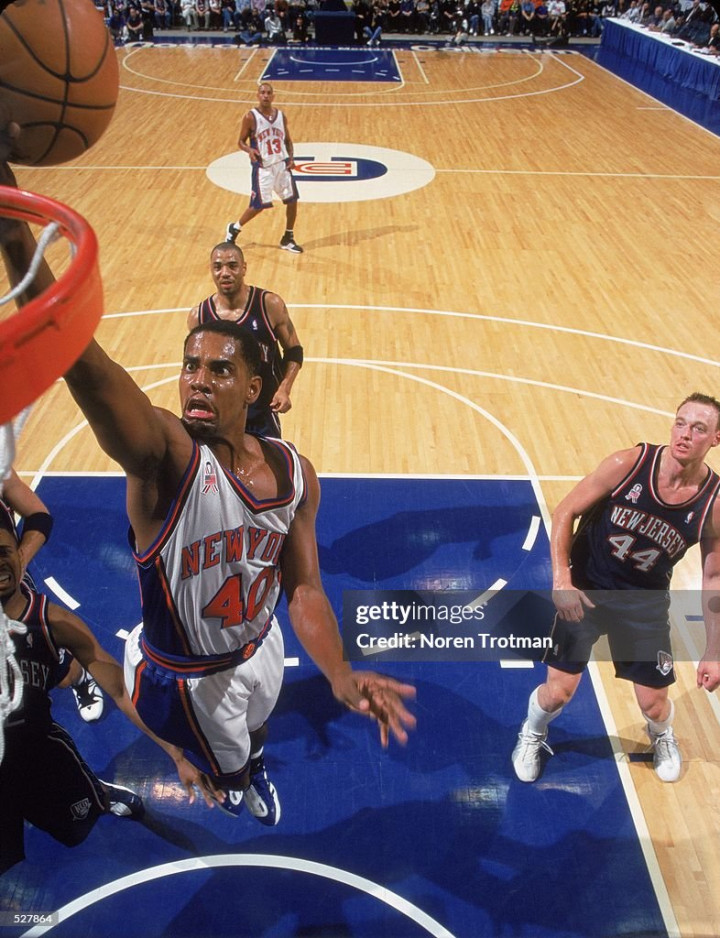当时纽约的阵容配置是这样的,37岁的老尤因仍是主力中锋,他不在的时候,著名的奥尼尔隔扣背景板杜德利首发,然后年轻的马库斯-坎比给这俩老头当替补,小前锋是已经全面退化的“大妈”拉里-约翰逊。狂人初来乍到,从替补做起,还不能和中投王组成双枪联袂首发,球队主控是查理-沃德。