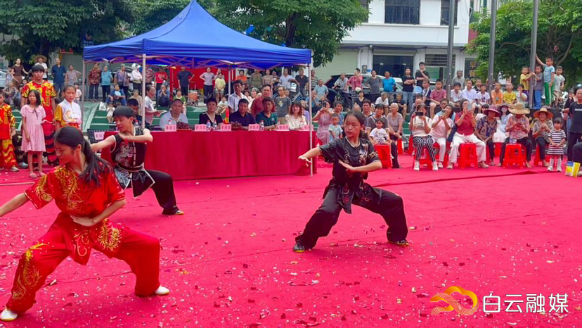 仪式现场,石湖武馆的武术表演和醒狮贺彩展现了传统文化的新活力。来自白云区内外及澳门特别行政区的曲艺同仁专程到场,赠送锦旗表达支持。这既是本地同仁对粤韵新阵地的鼎力支持,更是澳门友人跨越地域的同心贺礼,既见证粤曲文化一脉相承,也凝聚着非遗薪火相传的共同期许。石湖村还为捐资者谢健荣、谢素环夫妇赠送锦旗,感谢他们对曲艺社筹建的大力支持。